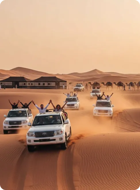 A jornada continua com um emocionante Safári no Deserto, conduzindo veículos 4×4 pelas dunas dos Emirados Árabes.